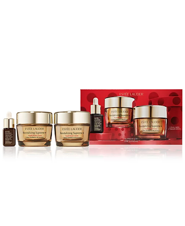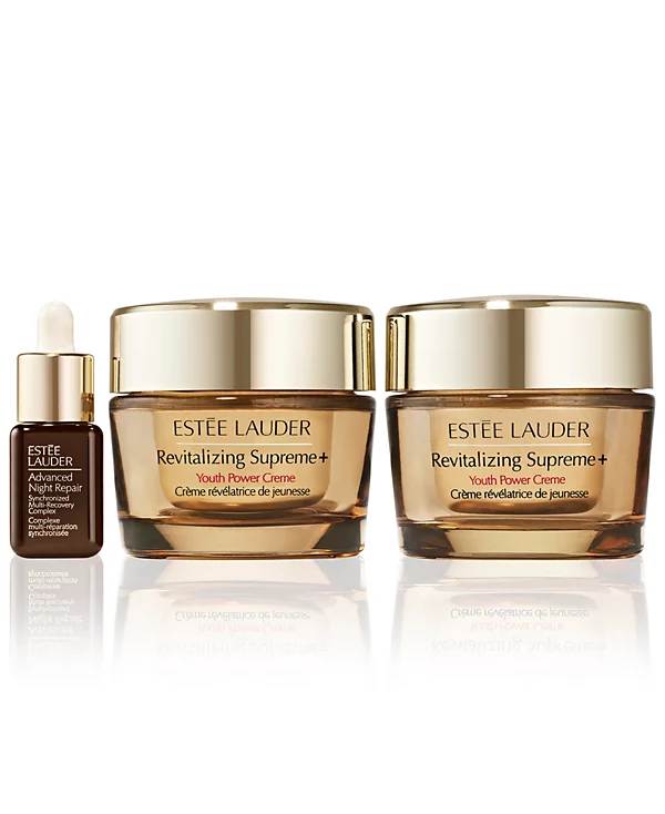 Double your glowing power with this limited-time set featuring two full-size Revitalizing Supreme+ Power Creme moisturizers. Indulge in this pair of silky-soft cremes to feel firmer, look radiant, more lifted. The set also includes a deluxe travel size of the Advanced Night Repair serum.
